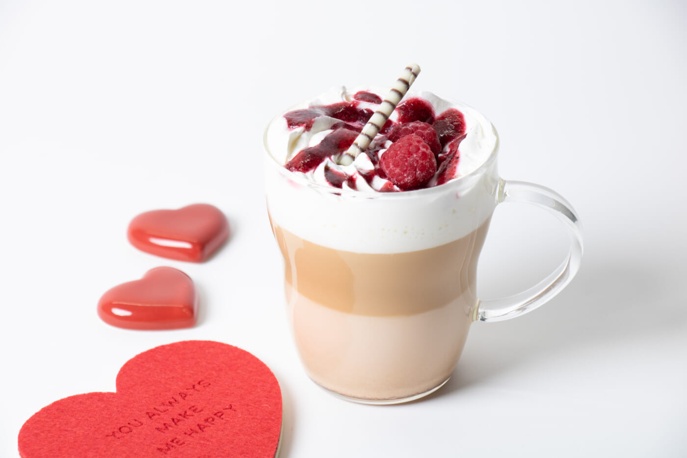 いちご風味とカフェラテを上品に合わせた一品です。ラズベリーのトッピングで味を引きしめます。